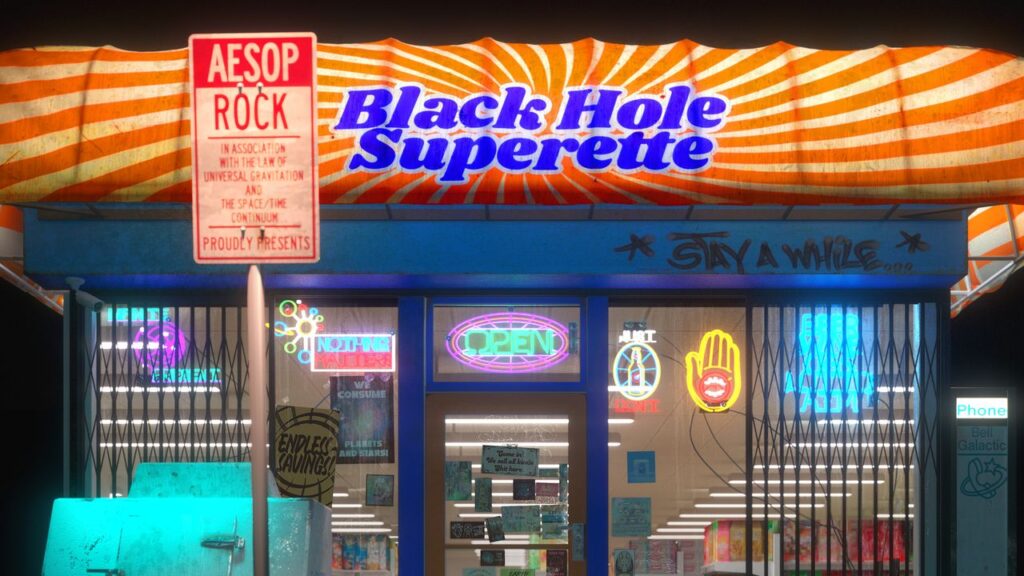 He largely avoids the sepia-toned nostalgia that can plague albums about discovering grays; any rearview-peeking inclinations show up primarily in the production. Since Skelethon, Aesop has handled the beats on solo albums, landing on a mix of chunky, cybernetic funk and jittery synth sequences. He gravitates toward tumbling, heavy drums and thick, distorted basslines—this is the guy who hired Yo La Tengo to be his backing band for a Late Show appearance. Black Hole Superette features some of his best compositions to date, a whittling down of his maximalist tendencies in favor of a more spacious sound that prioritizes wispy atmosphere over cluttered claustrophobia. He leans more into the rap production styles popular during his youth: The herky-jerky rhythms of “Checkers” and “Charlie Horse” have the blocky feel of the late 1980s, while “The Red Phone” evokes the ricocheting noise of the Bomb Squad. “Send Help,” with its syncopated chord structure and fluttery guitar line, could fit nicely on almost any release from the Rawkus heyday, while “Ice Sold Here” is a cold b-boy groove, looping like a DJ’s beat juggling routine. Aesop occasionally matches that energy with his flow, pulling his words taut on songs like “Himalayan Yak Chew” and “Snail Zero” in a way that evokes Grandmaster Caz or early Chuck D.