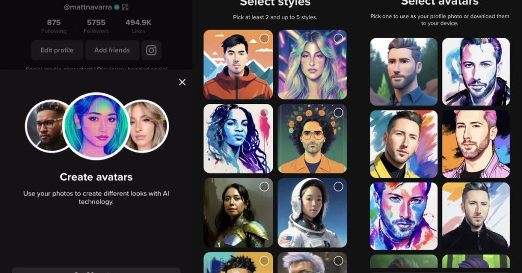 Begini cara kerjanya. Alat tersebut meminta Anda untuk mengirimkan tiga hingga sepuluh foto dan kemudian memilih dua hingga lima gaya berbeda untuk kemungkinan foto AI, kata Navarro. Setelah Anda melakukan ini, perlu beberapa saat sebelum foto benar-benar dibuat. Saat sudah siap, Anda dapat mengunduhnya, menetapkan salah satunya sebagai avatar, atau mempostingnya ke kisah TikTok Anda.