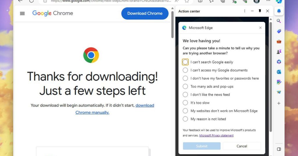 How many licks does it take to get to the center of a Google Chrome download in Microsoft’s Edge web browser? How many times will the company try to steer me away?